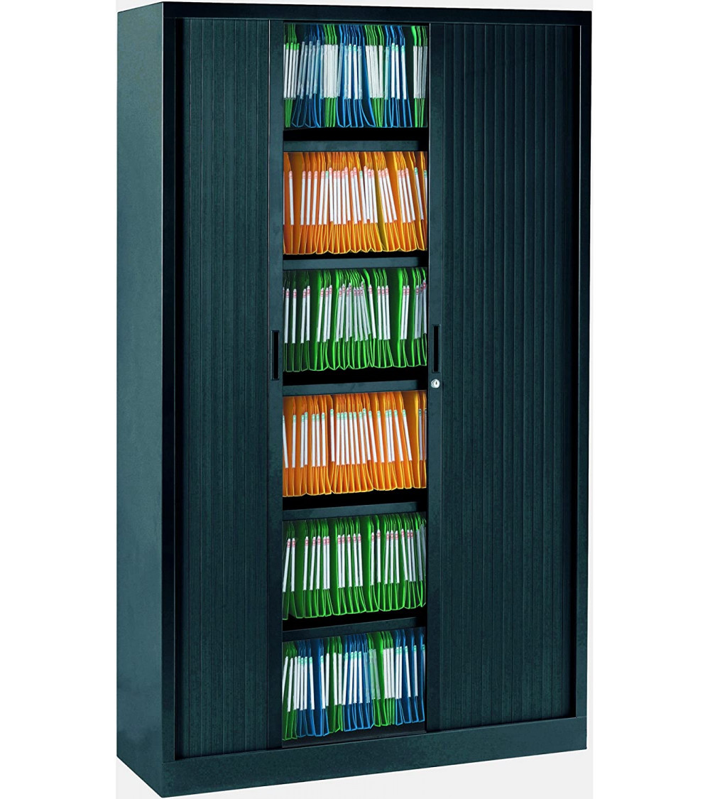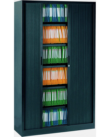 W. 120 cm x H. 198 cm, 4 étages + rail construction monobloc armoires avec portes à tambour en PVC résistante au feu M1 réglable pieds stabilisateurs réglable de l'intérieur du placard plinthe, étagères même lorsque chargées maintenu en place avec chevilles métalliques du placard à la partie supérieure et inférieure étagères équipés de rails de guidage pour dossiers suspendus terminal avec fermeture magnétique interchangeable avec serrure à cylindre, 2 clés fournies. Master Key étagères disponibles sur demande en finition assortie au placard Coque