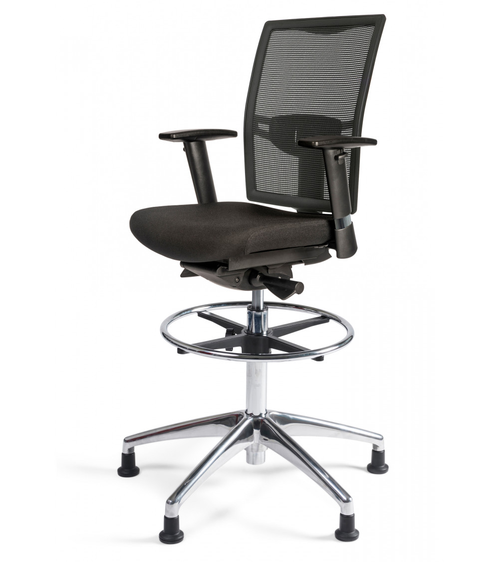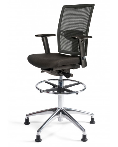 Dossier Design en résille hauteur fixe couleur noir soutien lombaire réglable en hauteur assise confort tissu accoudoirs obliques réglables en hauteur largeur et profondeur A10 accoudoirs équipés d'un dessus soft étroit réglable en profondeur 1815 mécanisme synchrone avec réglage du poids ZHT profondeur d'assise réglable sur 6cm vérin à gaz chrome 370mm en combinaison avec des patins plastiques et repose pieds piètement aluminium CL690